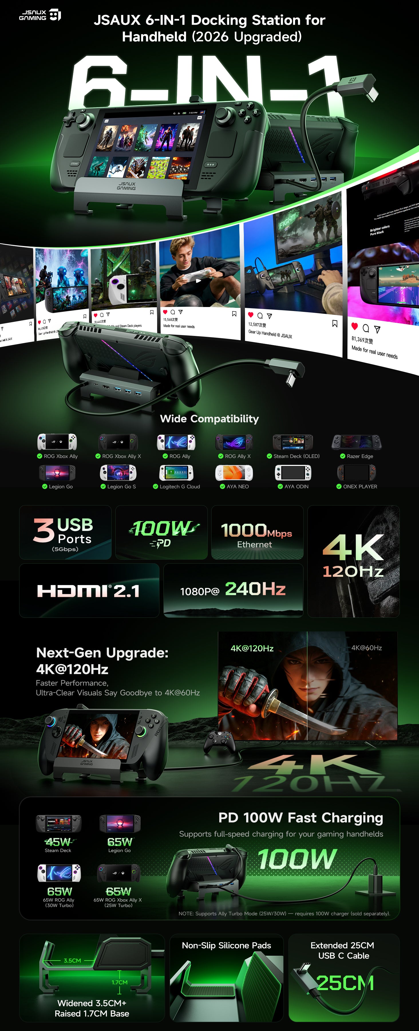 - 【ROG Xbox Ally / Ally X用6イン1ドッキングステーション】 ROG Xbox Ally / Ally X専用に設計されたこのドッキングステーションは、HDMI 2.1 4K@120Hz出力、100W PD急速充電、3×USB-A 3.0ポート、ギガビットイーサネットを備え、シームレスな大画面ゲーム体験を実現します。