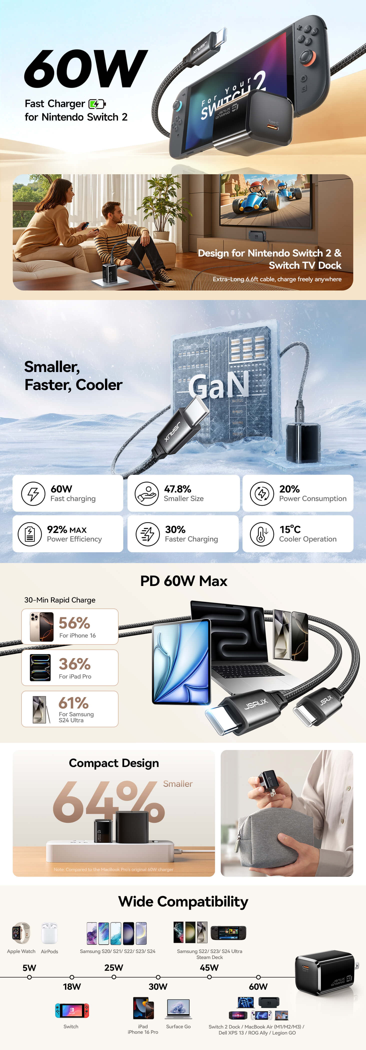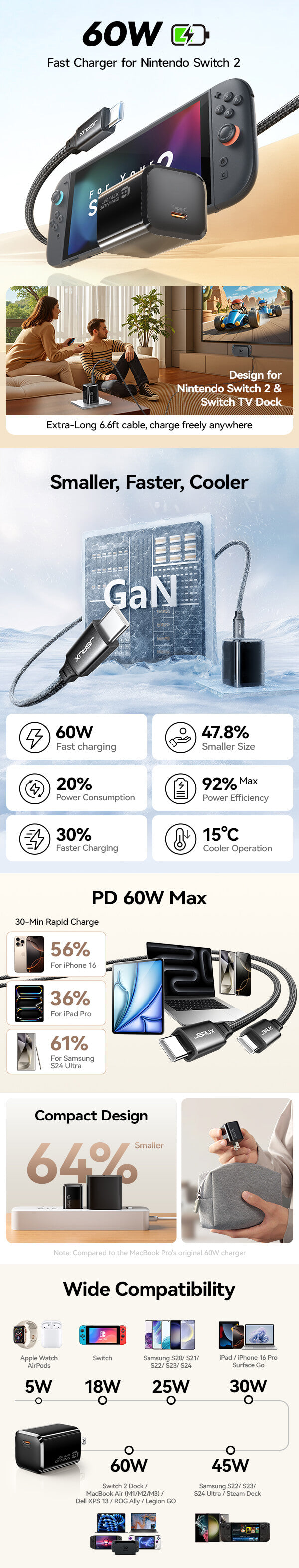- 【Compatibility】JSAUX 60W USB C charger is design for Nintendo Switch 2. It is also compatible with Switch OLED, Steam Deck, iPhone 17/16/15, Samsung S25/S24/S23, Google Pixel and more. It can charge most type c devices.