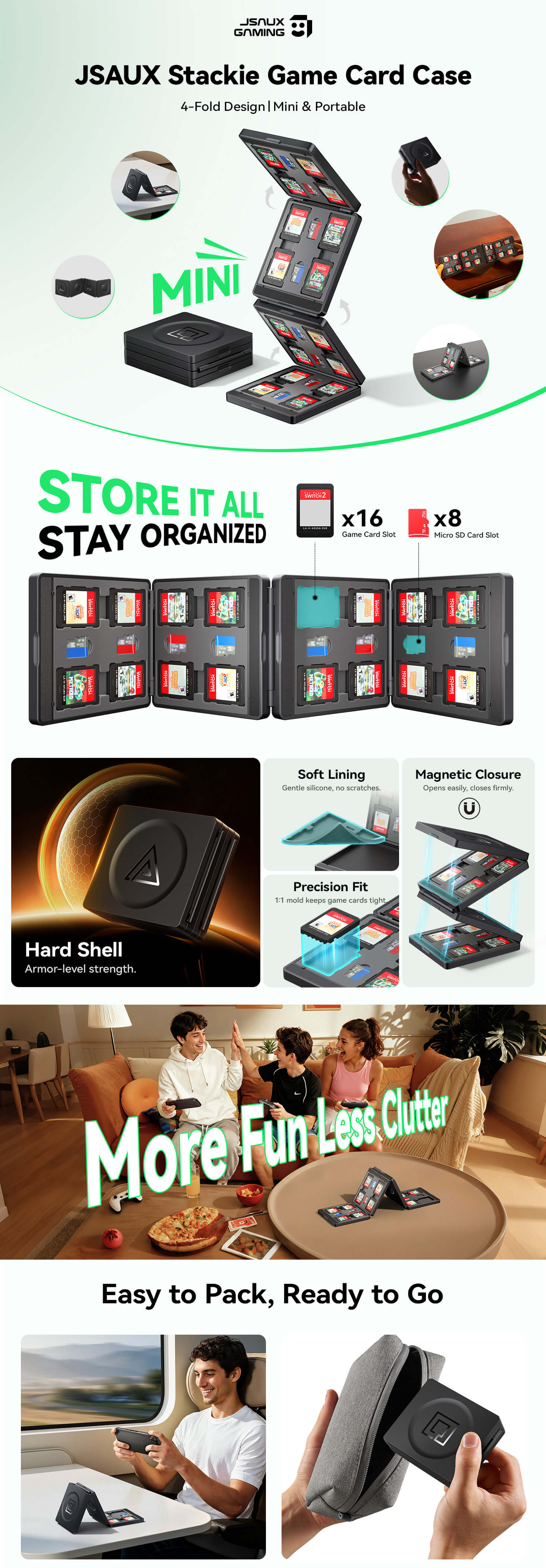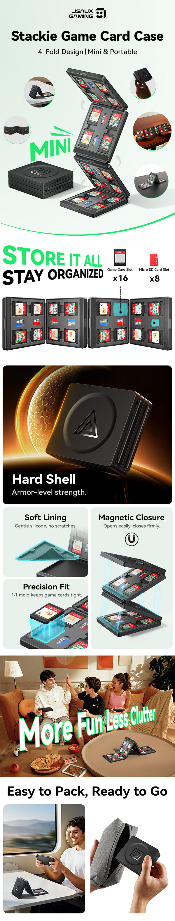 - 【Large Capacity & Smart Organization】Holds 16 game cards and 8 TF cards in well-arranged slots. Keep your collection tidy, organized, and within easy reach wherever you go.