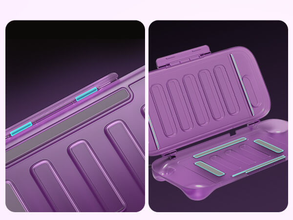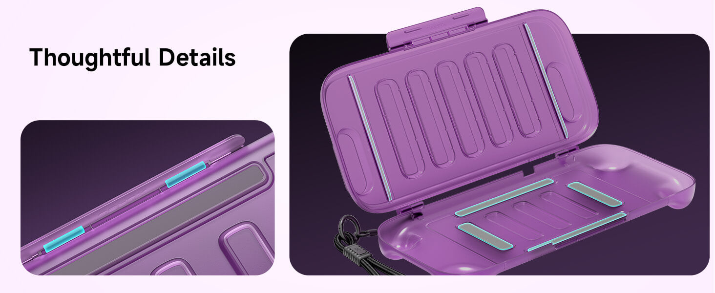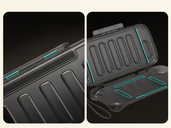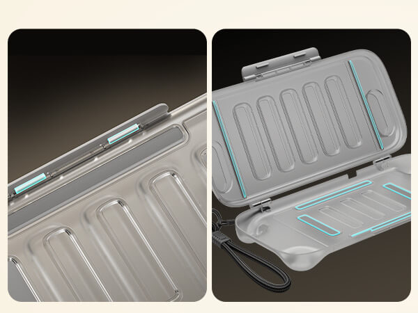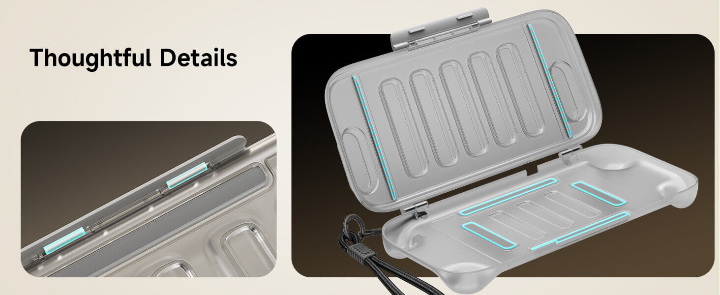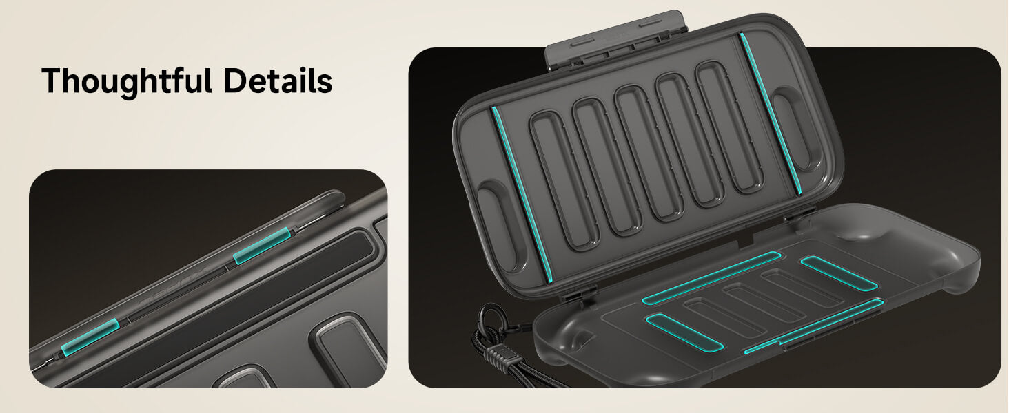 The case is perhaps my favorite when thinking about summer travel and trips, providing bomb-proof protection for the console. It also has space to protect the sticks and store up to 10 game cards; additionally, two silicone strips keep the console separated from the case to prevent contact and scratches.I also liked the closing system, which reminded me a bit of action cameras like GoPro, and promises not to open accidentally.