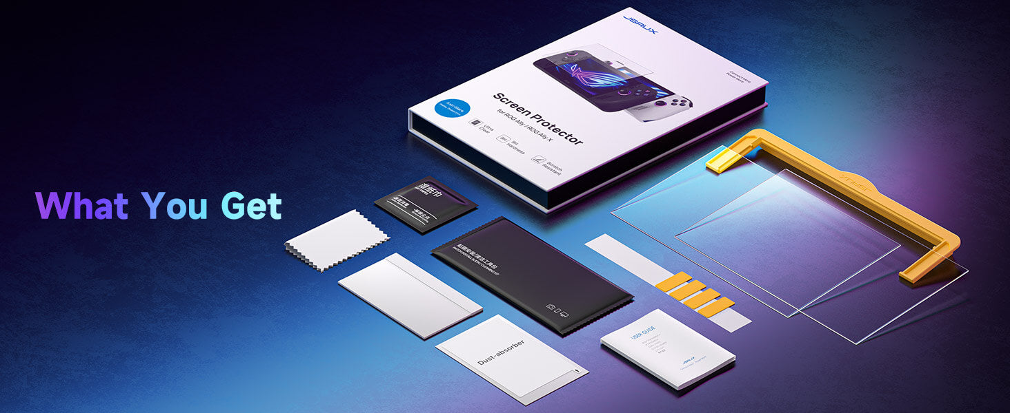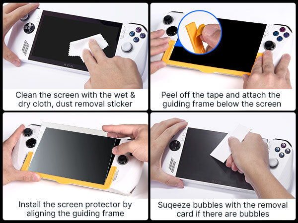 - 【What You Get】 You will get 2 * JSAUX tempered glass screen protector for ROG Ally, 1 * Guiding frame, Cleaning wipes, Dust sticker, Microfiber cloth, Squeeze card, Easy installation manual.