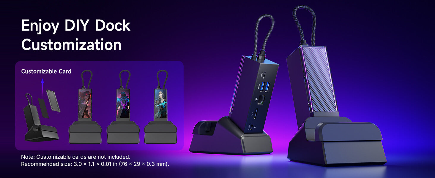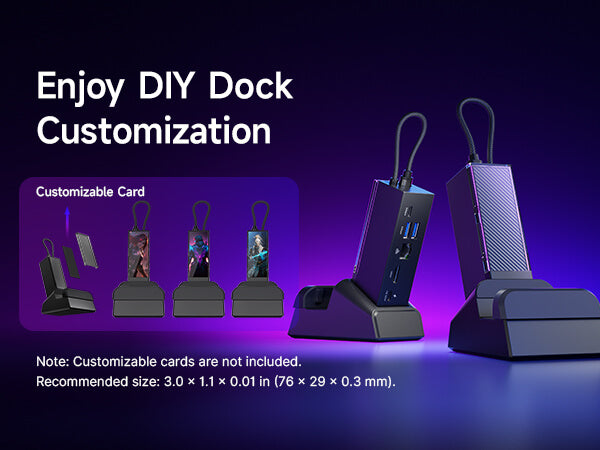 - 【DIY Customize Your Docking Station】Easily personalize your docking station by adding a custom card between the front cover and the dock. Just remove the cover, insert your card, and snap the cover back on. NOTE: Recommended card size is 3.00" x 1.13" x 0.01" (76.3mm x 28.7mm x 0.3mm). Custom cards NOT included