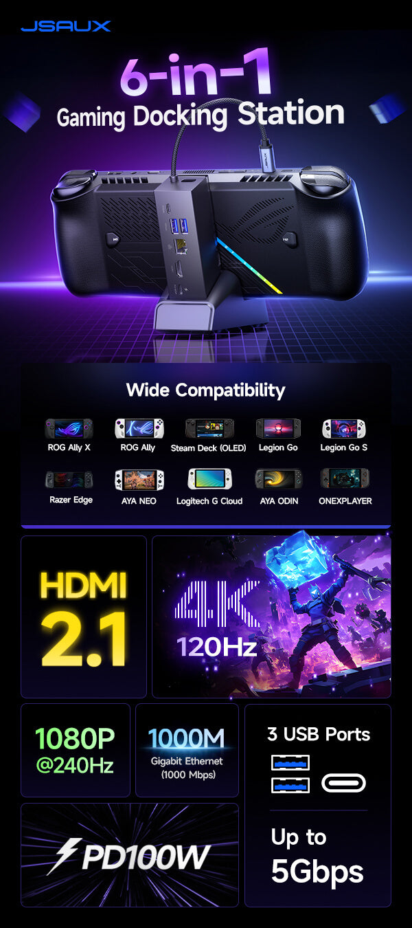 - 【6-in-1 Docking Station for Handheld】Experience enhanced gaming with 4K@120Hz HDMI output, Gigabit Ethernet, USB C PD charging, USB C 3.2 Gen 1, and dual USB A 3.2 Gen 1 ports