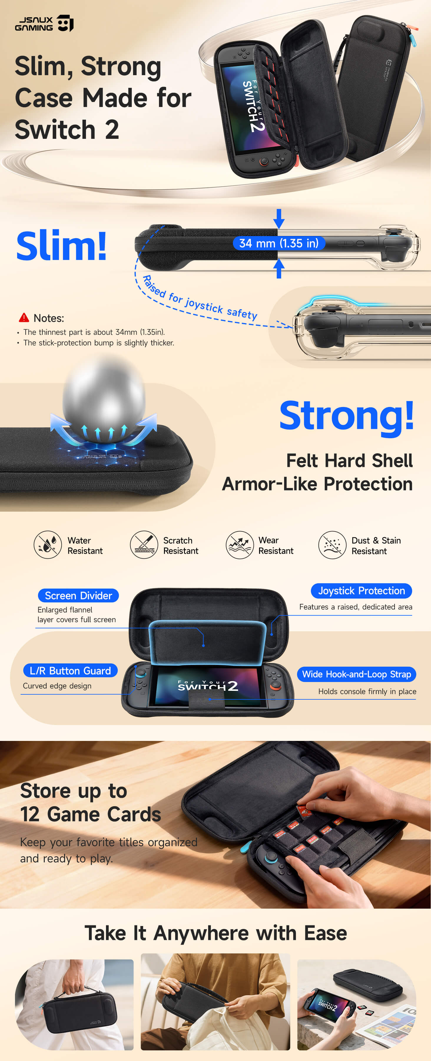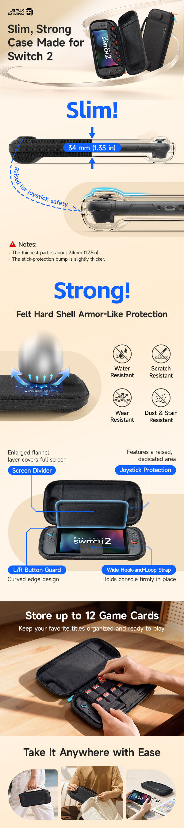 - 【Pro-level evolution, fits easily in any bag】:30% slimmer than typical cases, precisely engineered to fit Switch 2 — perfect for backpacks, totes, or handheld carry.