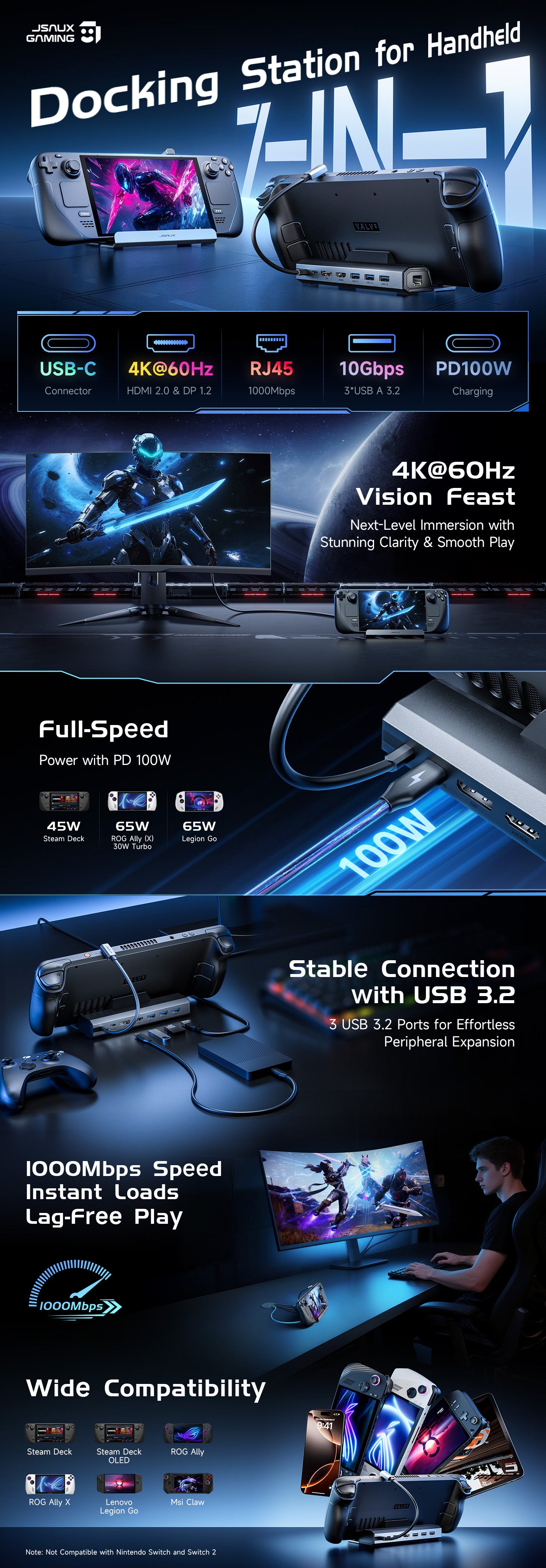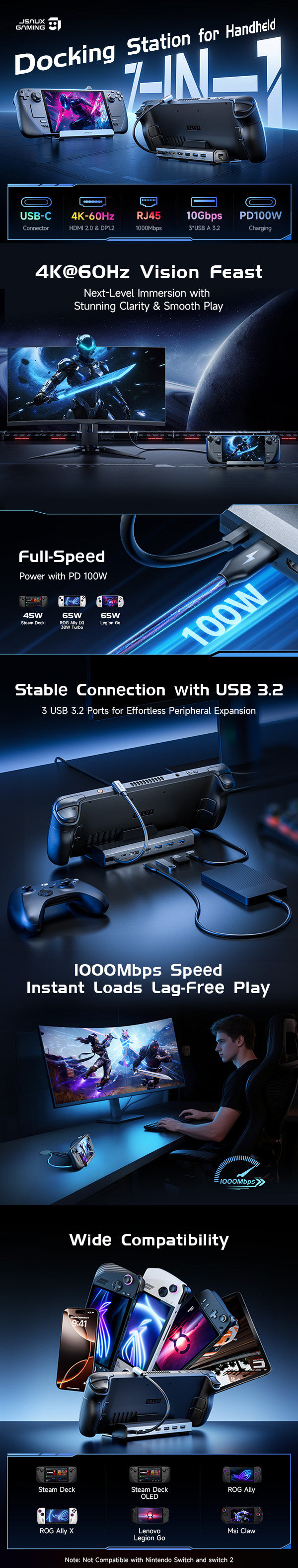 - 【Wide Compatibility】Compatible with Steam Deck / Steam Deck OLED, ROG Ally / Ally X, Legion Go / Go 2 / Go S, MSI Claw, and other USB-C handheld gaming devices.(❌ Not compatible with ROG Xbox Ally / Ally X.)