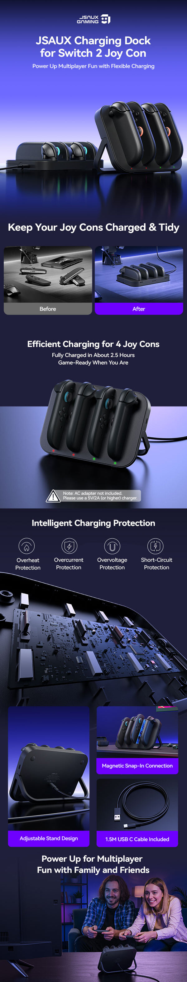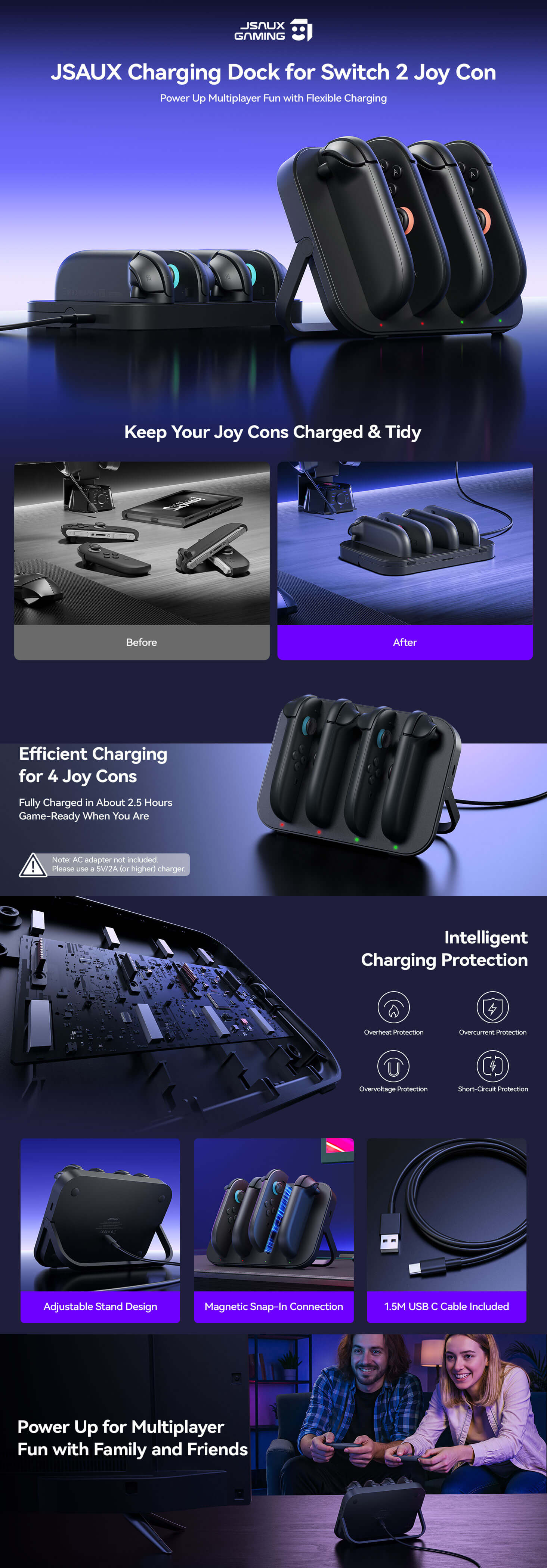- 【Charge 4 Joy-Cons at Once】: Perfectly tailored for Nintendo Switch 2, this controller charging dock offers a snug, secure fit—allowing you to power up to 4 Joy-Cons simultaneously. Ideal for families or multiplayer sessions.