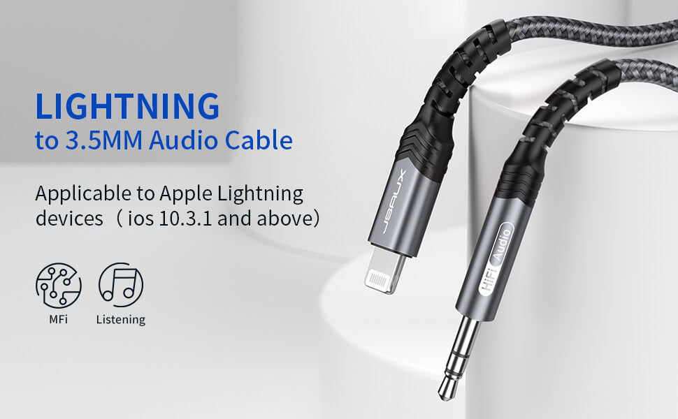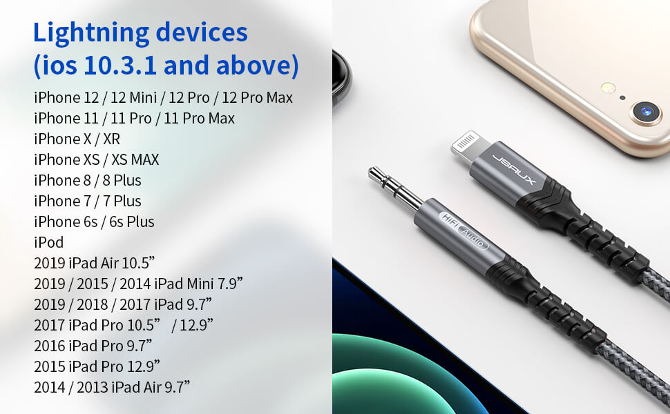 - 【Compatibility List】: JSAUX Lightning to 3.5mm Car Audio Cable compatible with iPhone 14 / 14 Plus / 14 Pro / 14 Pro Max /iPhone 13 / 13mini / 13 Pro / 13 Pro Max / 12 / 12 mini / 12 Pro / 12 Pro Max / 11 / 11 mini / 11 Pro / 11 Pro Max / XS / XS Max / XR / X / 8 / 8 Plus / 7 / 7 Plus, iPod touches 6th Generation, iPad Mini / iPad Air / iPad Pro. (NOTE: Doesn't compatible with Airpods Max, Beats Solo Pro, 2018 iPad Pro 12.9" , iPad Pro 11", and iPad air 2020 gen4)