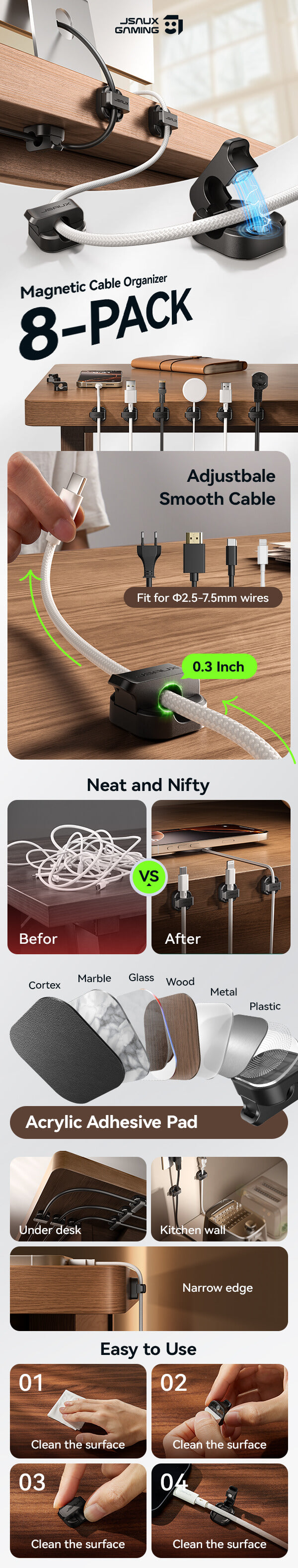 - 【Wide Compatibility, Secure Hold】:Supports most mainstream cables including USB cables, earphone cables, keyboard/mouse cables, computer cables, network cables, power strips, and kitchen appliance cords. Fits cables up to 7mm (including HDMI). Strong magnetic grip ensures cables stay firmly in place.