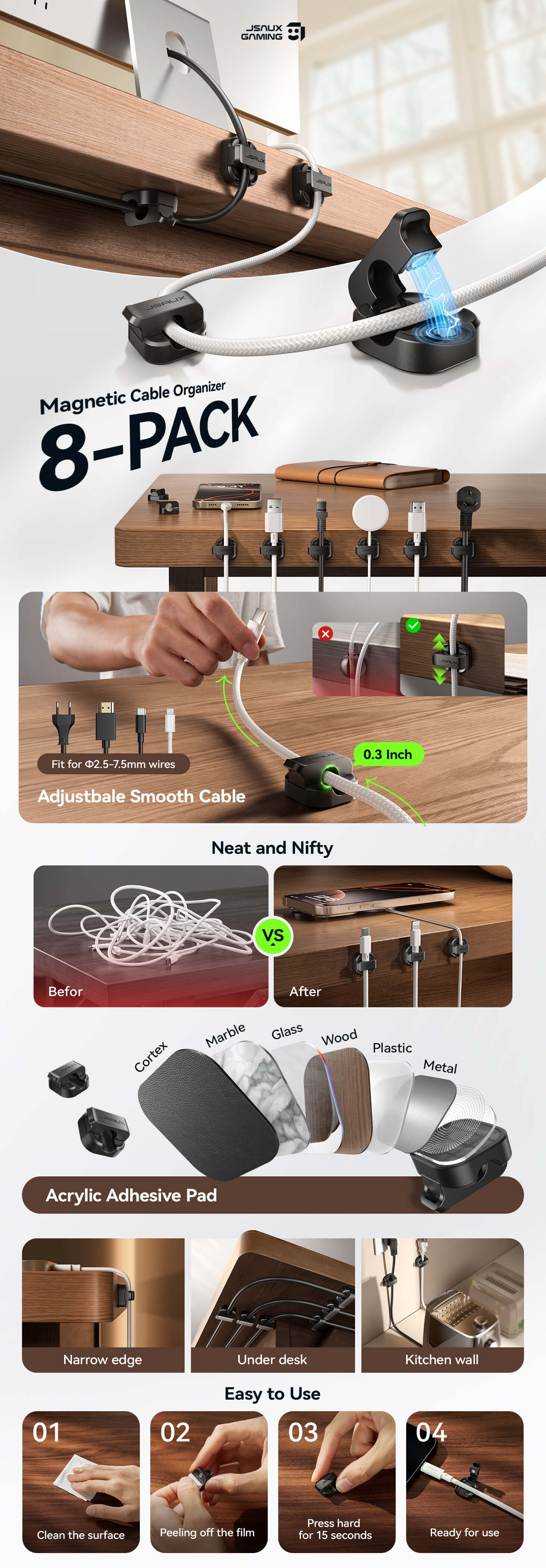 - 【Flexible Expansion, Multi-Scene Use】:Magnetic clips can be freely combined, with removable adhesive bases included for repositioning. Perfect for office desks, bedside tables, TV stands, gaming setups, and even in cars.