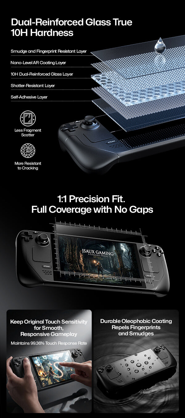 - 【Fingerprint-Resistant & Smudge-Proof,Stays Clean Longer】Advanced AF oleophobic coating applied via synchronized electroplating process. Resists fingerprints and oil stains, wipes clean with ease, and keeps your Steam Deck display looking pristine over time.
