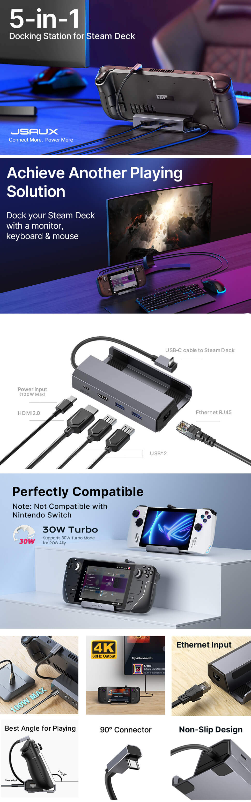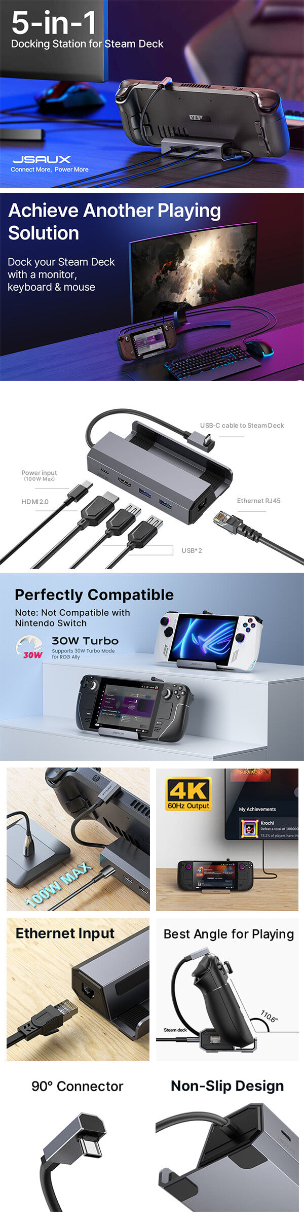 - 5-in-1 Docking Station for Steam Deck and ROG Ally: Features 4K@60Hz HDMI output, 100 Mbps RJ45/Ethernet input, USB-C charging, and dual USB-A 2.0 ports.