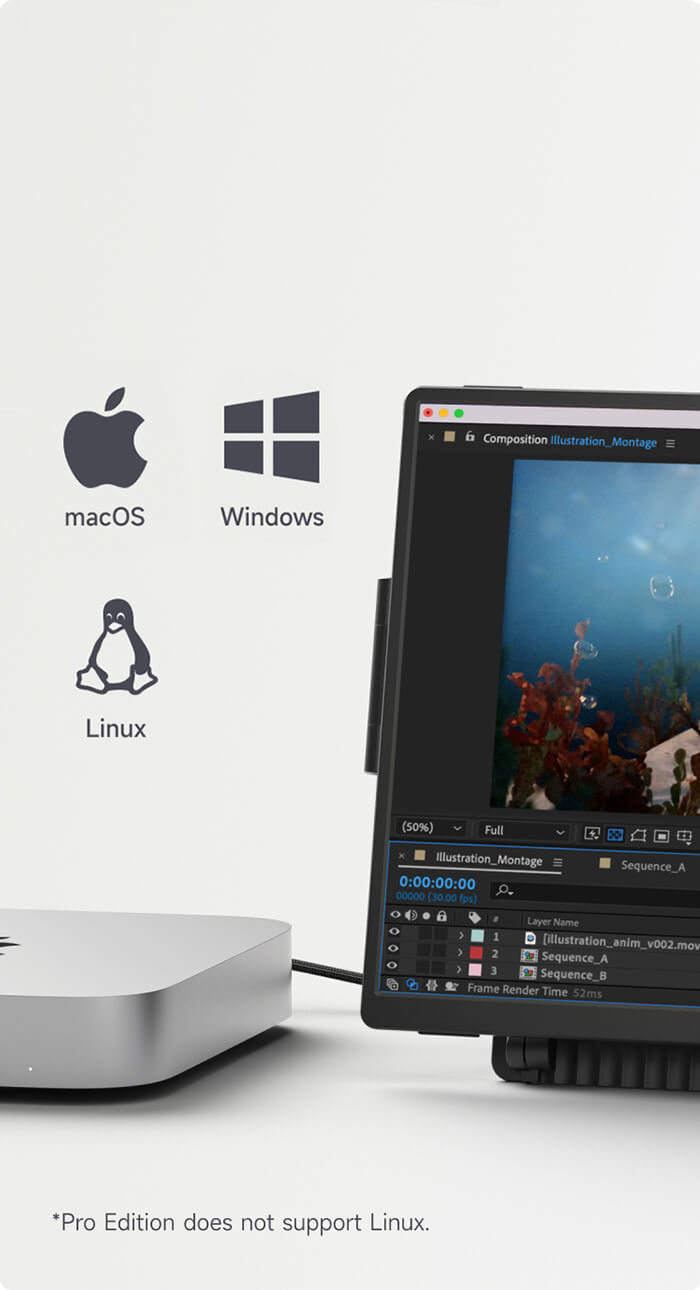 标准版和专业版的屏幕相同。区别在于支架:专业版包含扩展坞功能,支持 USB 扩展、反向电源和千兆以太网。