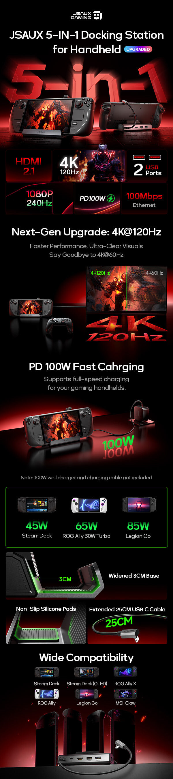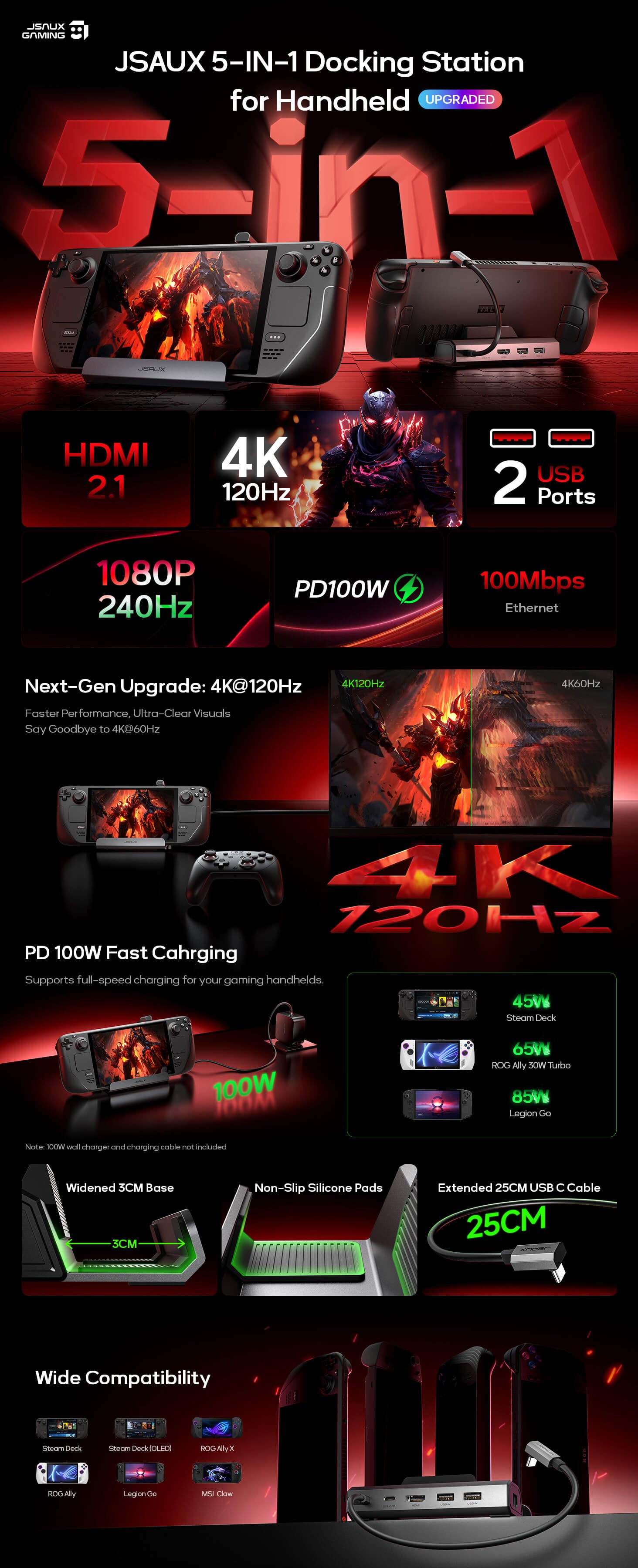 - 适用于 Steam Deck 和 ROG Ally 的 5 合 1 扩展坞:具有 4K@60Hz HDMI 输出、100 Mbps RJ45/以太网输入、USB-C 充电和双 USB-A 2.0 端口。